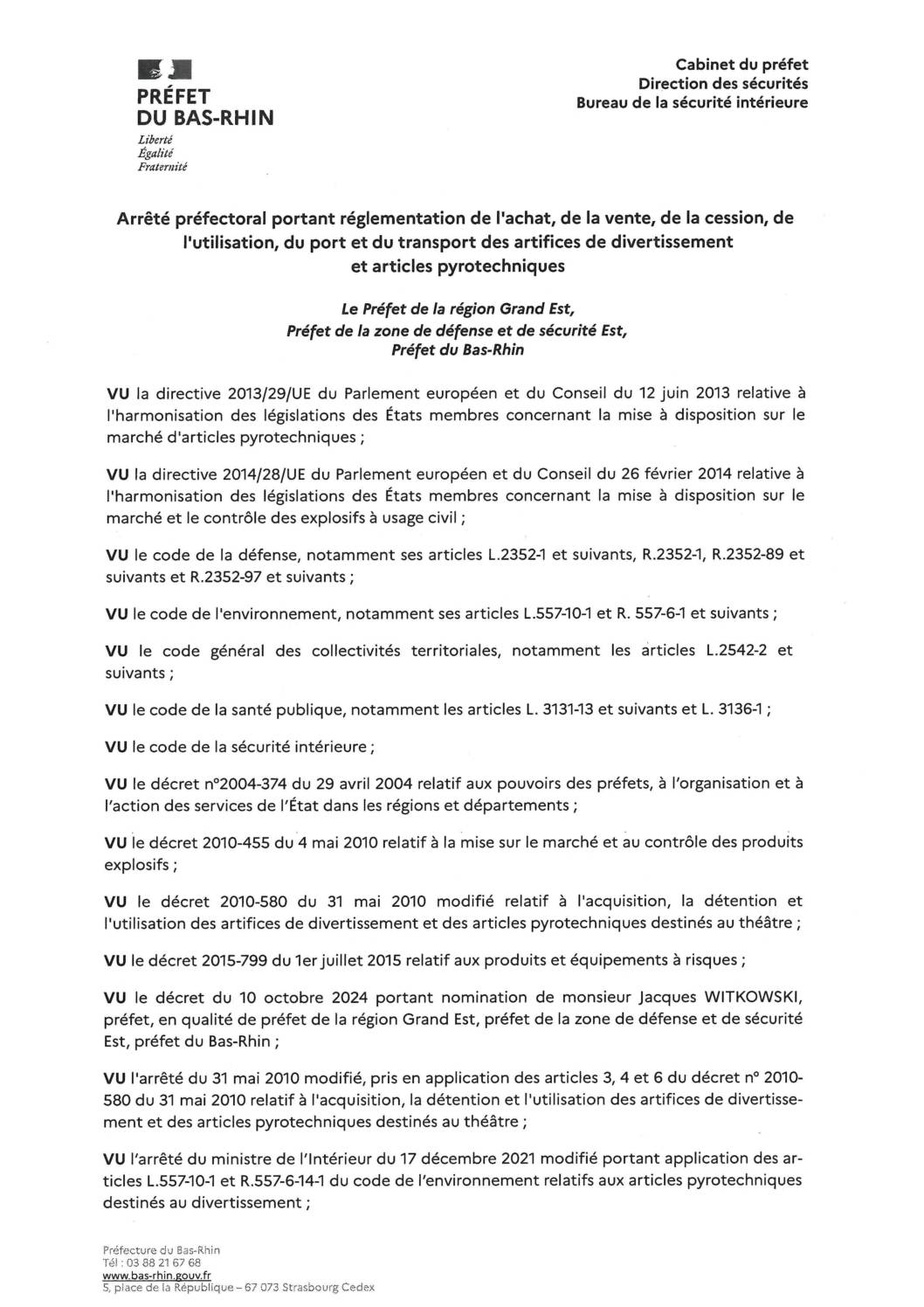 Arrêté préfectoral réglementant l’achat, la vente, la détention, le transport et l’utilisation d’artifices de divertissement et d’articles pyrotechniques