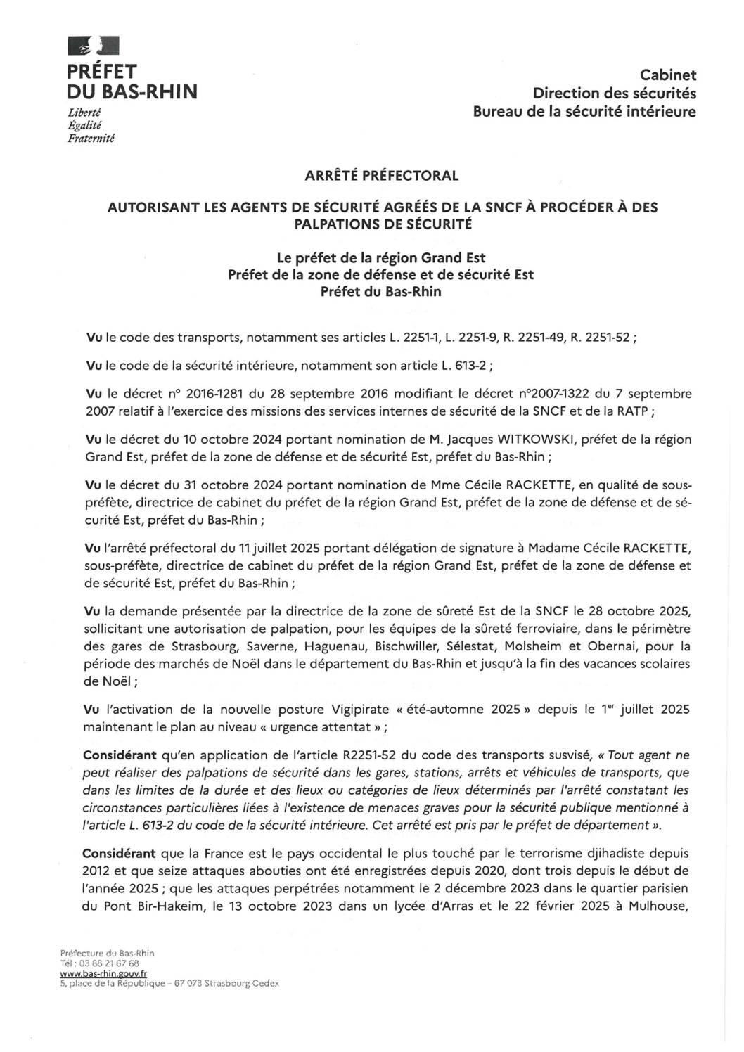 Arrêté préfectoral – Autorisant les agents de sécurité agréés de la SNCF à des palpation de sécurité