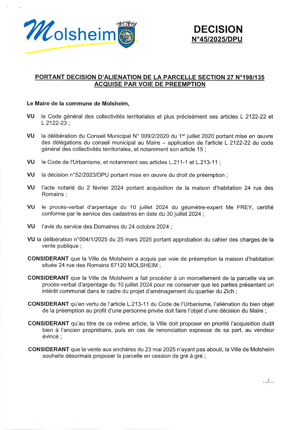 Décision DPU n°45/2025 – Aliénation parcelle section 27 n°198/135 Acquise par voie de préemption