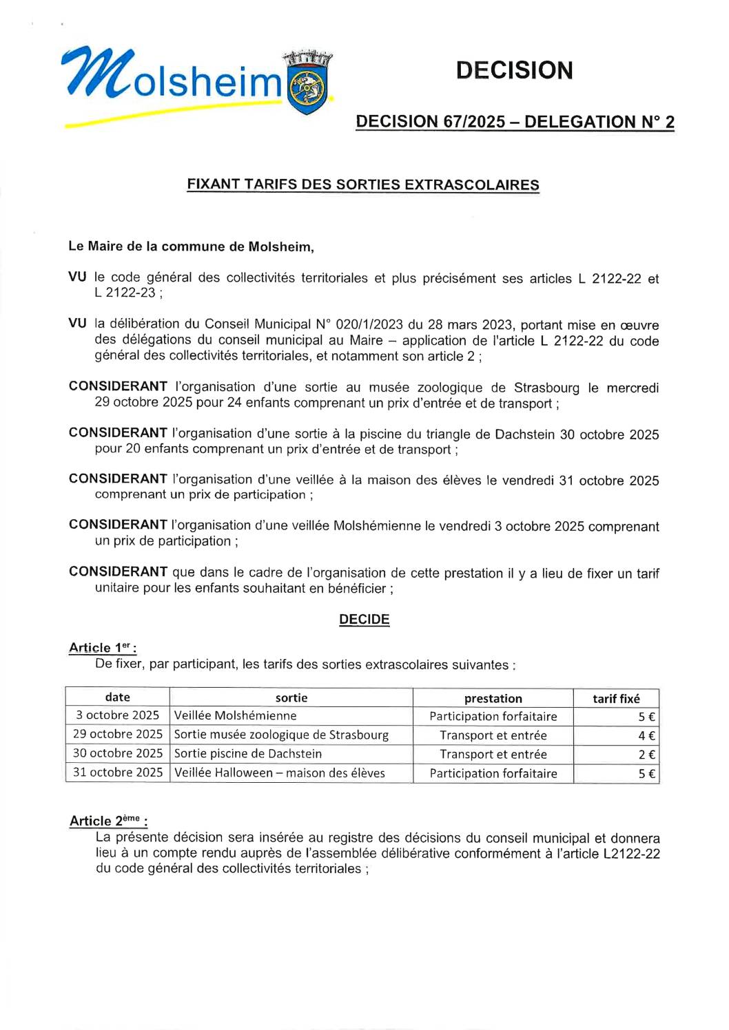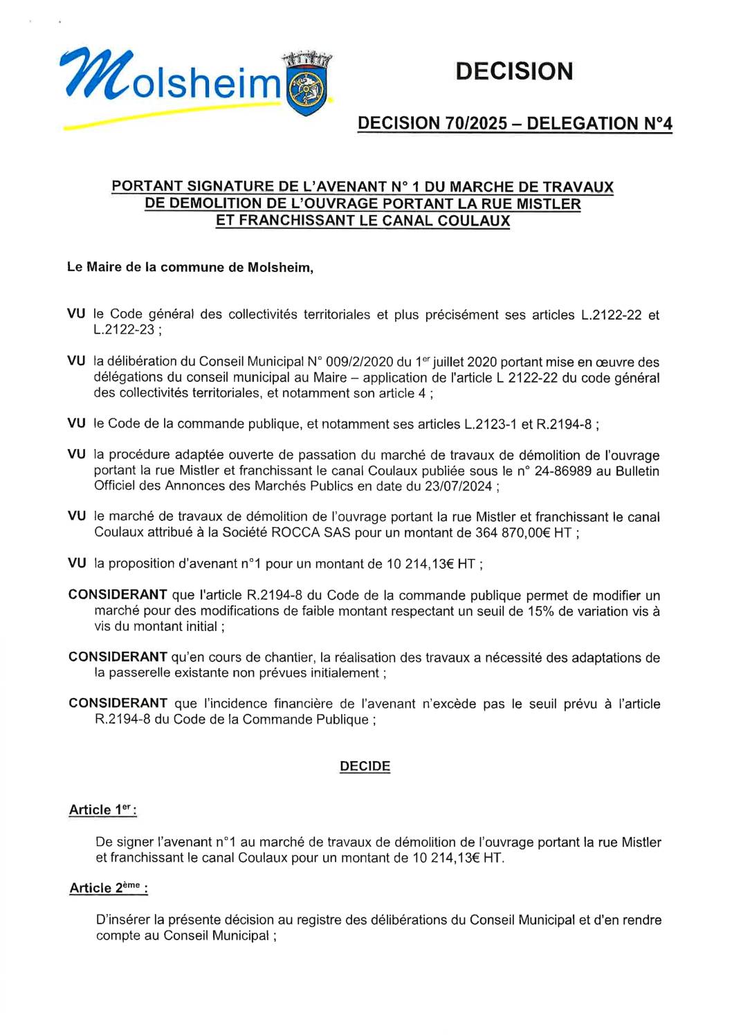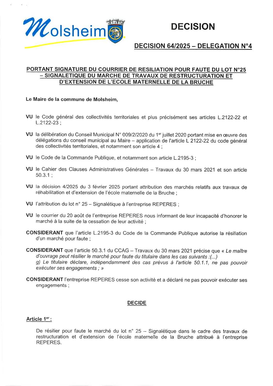Décision n°64/2025 – Délégation n°4 portant résiliation pour faute du lot n°25 EM Bruche