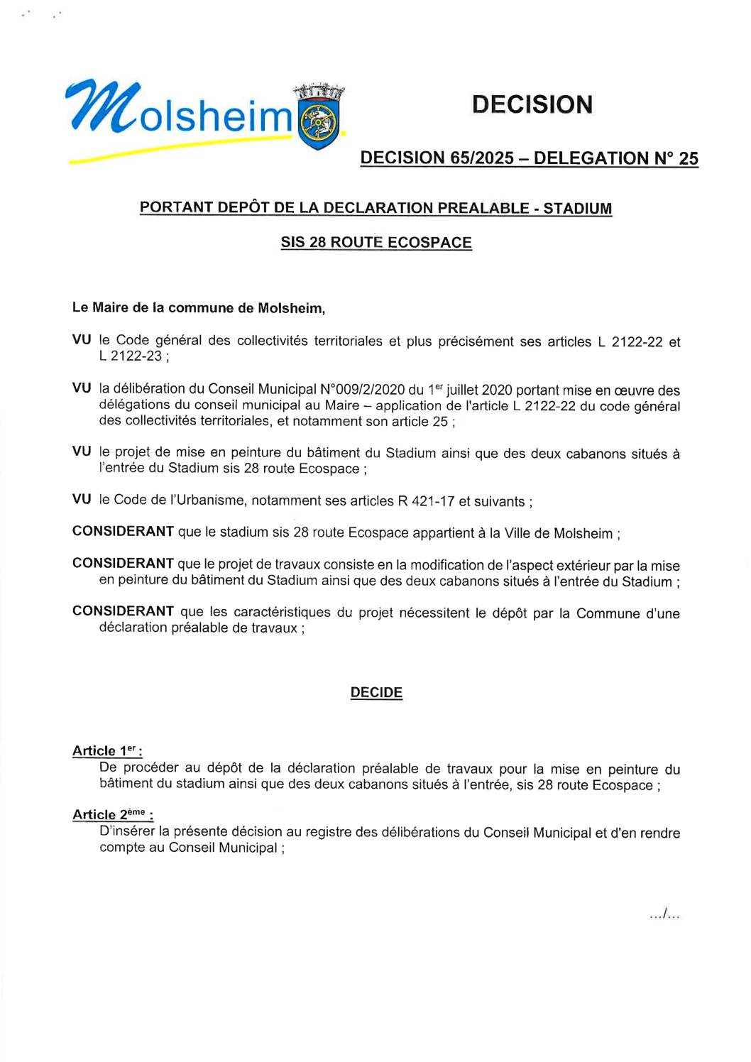 Décision n°65/2025 – Délégation n°25 – Portant dépôt de la déclaration préalable – Stadium Sis 28 route Ecospace