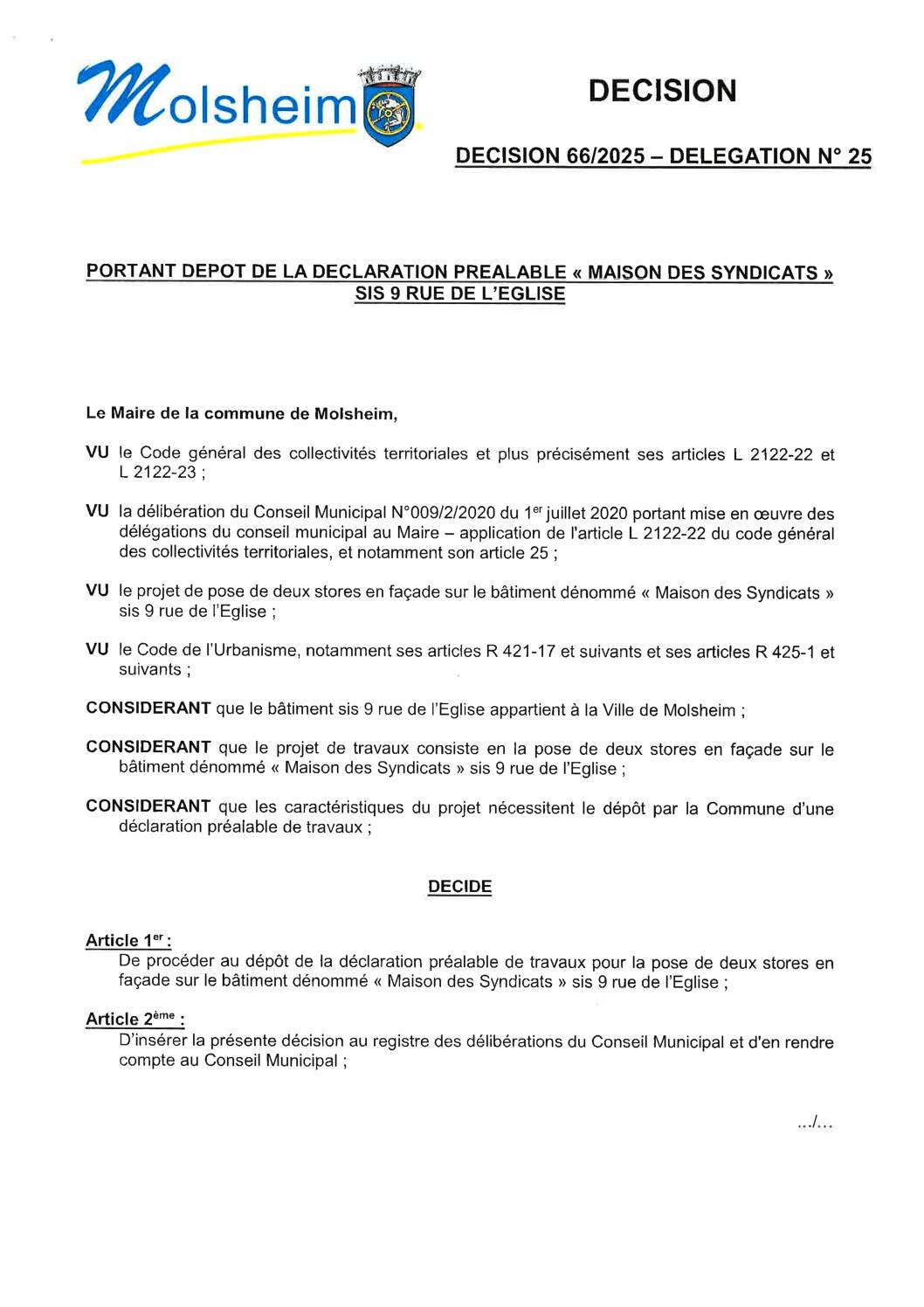 DÉCISION 66/2025 – DÉLÉGATION N’25 – DÉCLARATION PRÉALABLE TRAVAUX MAISON DES SYNDICATS