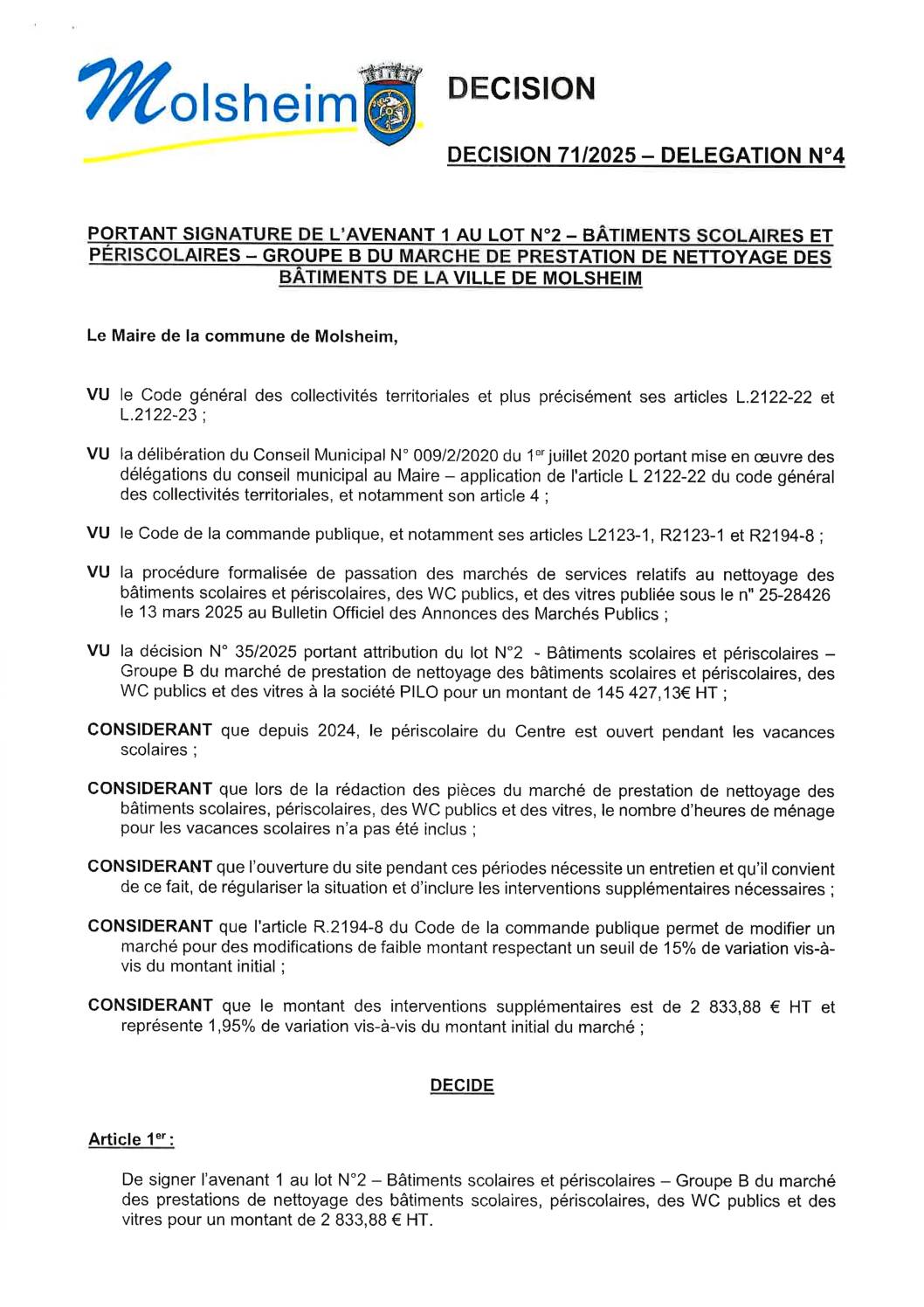 Décision n°63/2025 – Délégation n°4 – Signature de l’avenant n°1 du marché lot n°2 « Sanitaires » des travaux de rénovation et mise aux normes de la maison du Rott