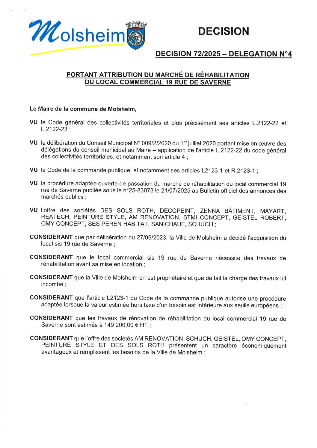 Décision n°62/2025 – Délégation n°4 – Avenant n°1 du lot n°6 « Cloisons » au marchés de travaux de rénovation et mise aux normes de la maison du Rott
