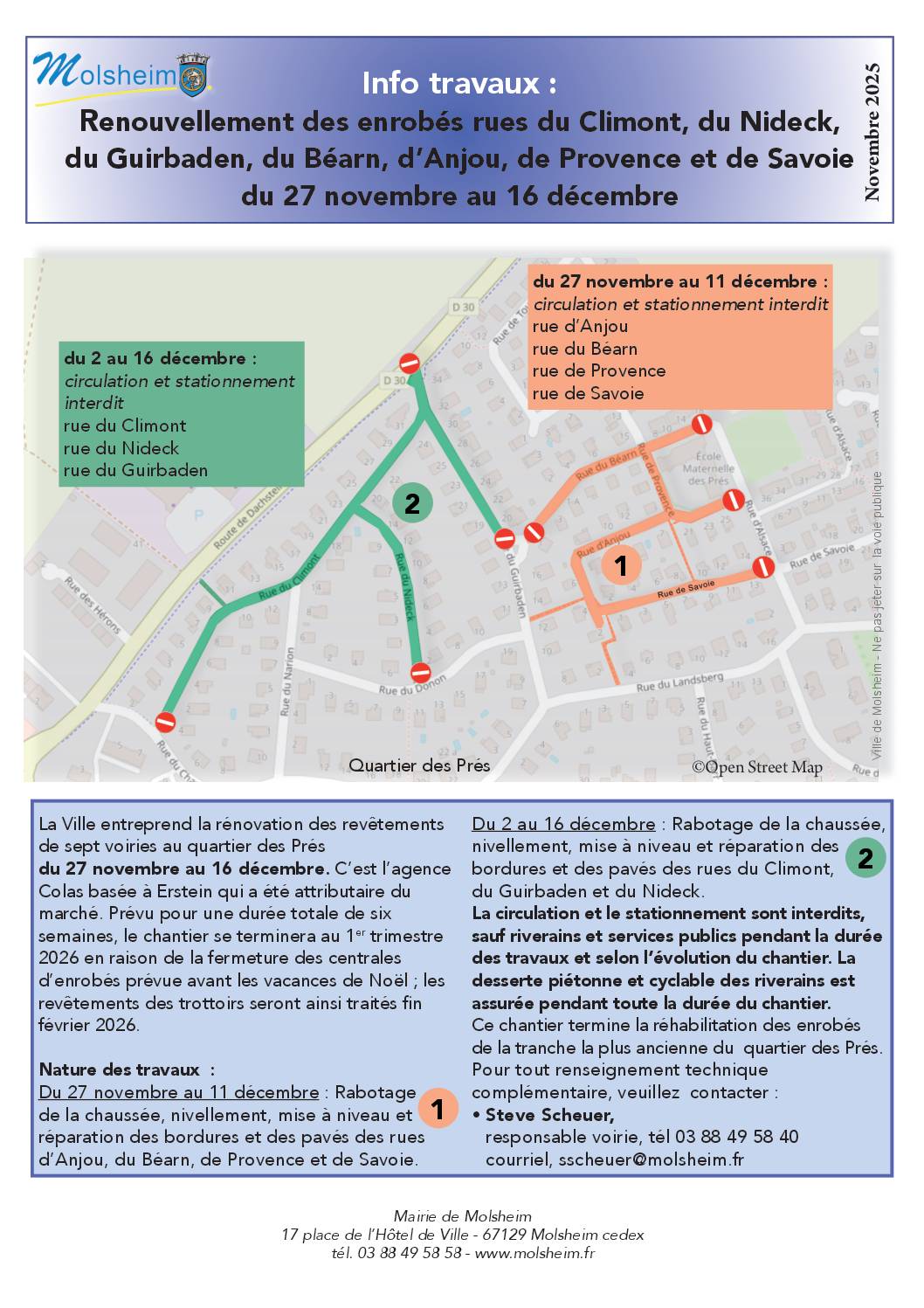 du 27 novembre au 16 décembre. C’est l’agence Colas basée à Erstein qui a été attributaire du marché. Prévu pour une durée totale de six semaines, le chantier se terminera au 1er trimestre 2026 en raison de la fermeture des centrales d’enrobés prévue avant les vacances de Noël ; les revêtements des trottoirs seront ainsi traités fin février 2026.